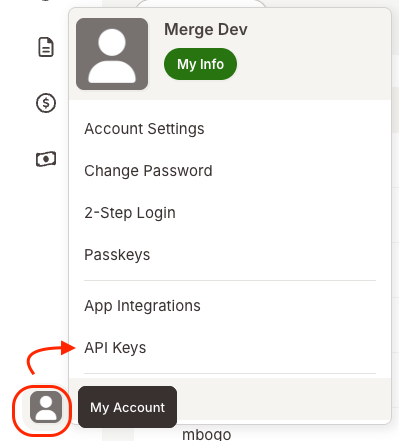 - Click on the profile avatar in the bottom left-hand corner and in the user context menu click on API Keys.