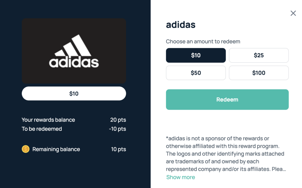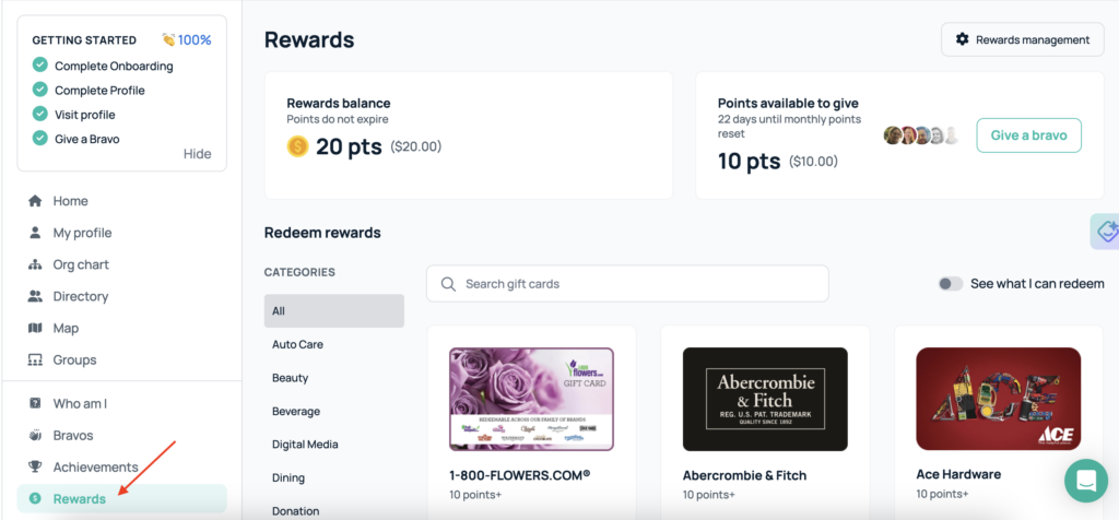 Rewards are configured and determined by your admin team. If you don’t see rewards available on your dashboard, feel free to reach out to your admin to confirm availability.