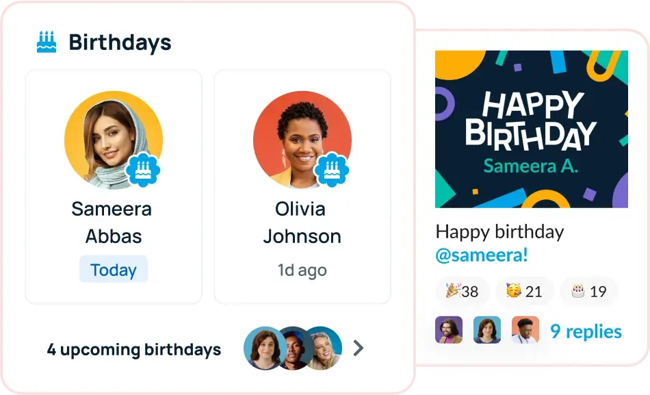 See upcoming employee birthdays in the GoProfiles dashboard and get alerted on the day in Slack, Microsoft Teams, or email. Celebrate coworker birthdays wherever your company communicates.